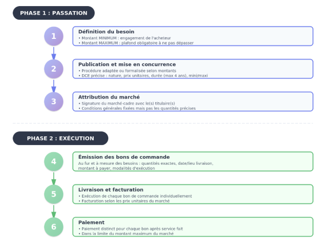 Point essentiel : L’accord-cadre ne crée pas d’engagement ferme de commande. Il fixe uniquement un cadre contractuel (prix, conditions d’exécution, clauses) dans lequel s’insèreront des marchés subséquents ou marchés d’application.