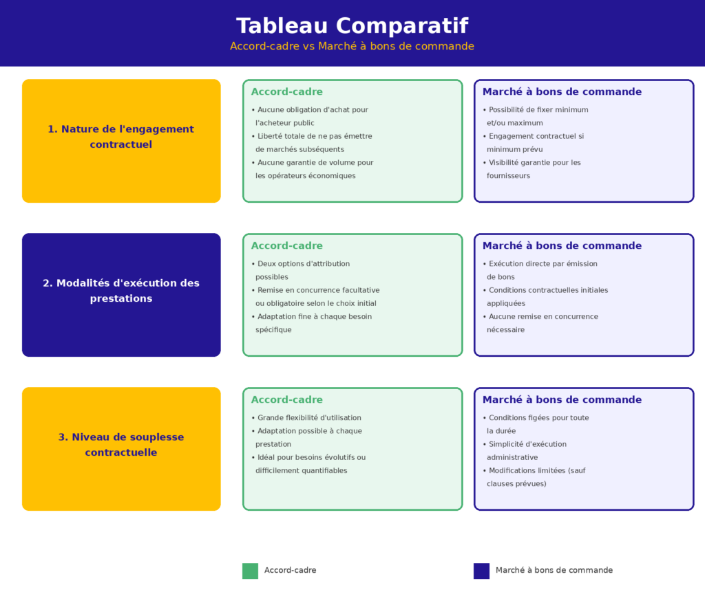 Différence majeure : Contrairement à l’accord-cadre, le marché à bons de commande crée un engagement contractuel dès sa notification.