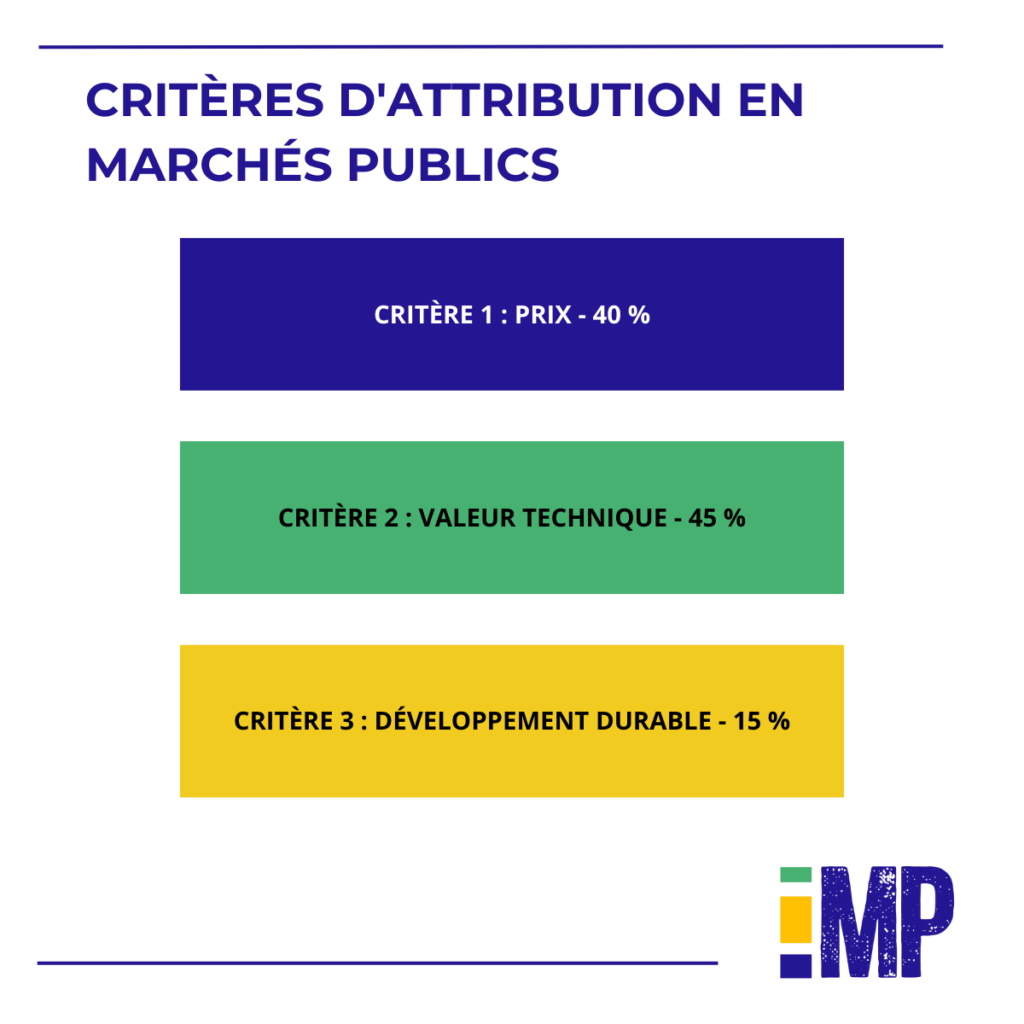 Les critères classiques incluent : prix, valeur technique, performances environnementales, délai d’exécution, service après-vente et garanties.